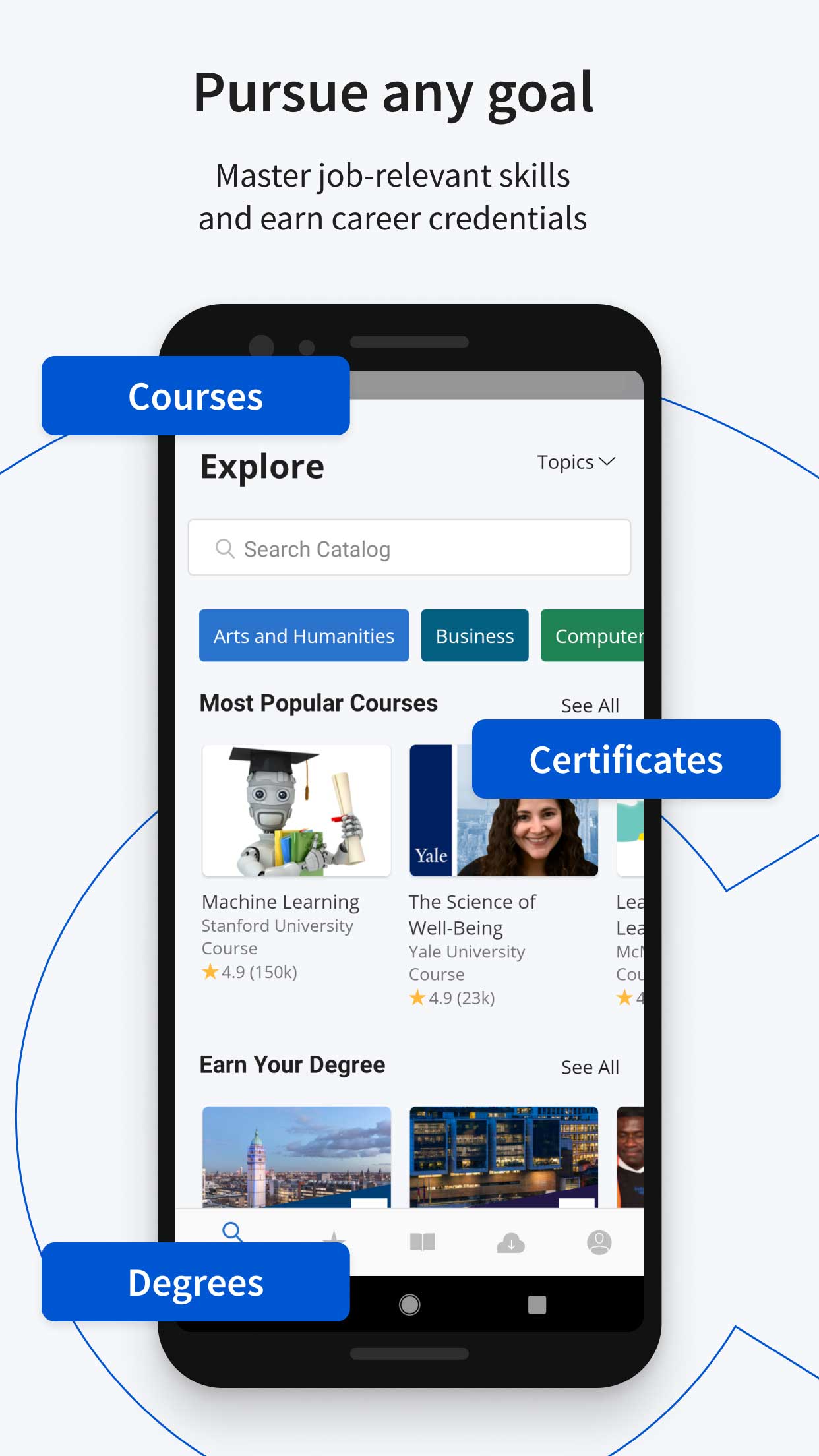 ۳. تنوع موضوعی: کورسرا طیف گستردهای از رشتهها و مهارتها را پوشش میدهد، از علوم کامپیوتر گرفته تا هنر و علوم انسانی.